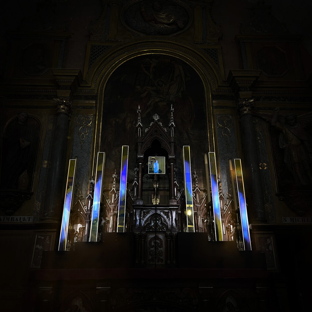 TD: During the Nuit Blanche organised by the Centre d’Art Contemporain le Kiosque, curated by Mathias Courtet, I actually created an installation of six Dichroic works in a church. When I started to work on certain Dichroics in a thin, vertical shape that I called Totems, my intention from the outset was to make them into a kind of sculpture. I also wanted to multiply them so that they could be exhibited in the form of installations. One of my references was the stained glass windows in cathedrals and the shape of organs, with these vertical lines that go up and down. In this exhibition organised by Le Kiosque I wanted to achieve an installation that would be both extremely well integrated into the church as well as being very contemporary. The totems reflected very intense yellow rays along the length of the church, immersing the spectators in them and blinding them a little…