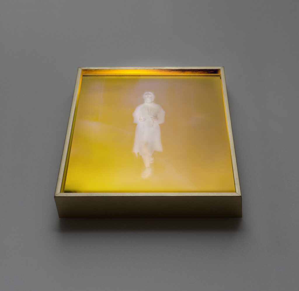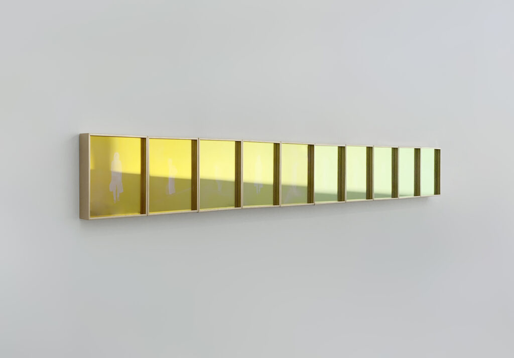 Technically the dichroic glass is positioned in front of the photographs I make and then encased in a frame that I gild with gold leaf. The light from this glass is then also reflected on the gilding, which adds an almost solar aspect to these works.
