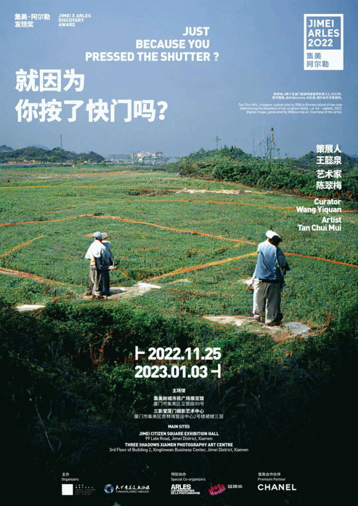 马来西亚华裔电影人陈翠梅是2022年集美·阿尔勒国际摄影季“发现奖”得主。在中国厦门,陈翠梅的第一次个展《就因为你按了快门吗?》从对她原乡福建金门的复杂情感出发,营造了一个视觉丰富又饱含隐喻的多图层展览,监控摄像头、AI图像生成算法、地图都被纳入到她个人化的图像表达之中,以此讨论华人离散往事,也质疑今日现实物权中的“拥有”。今年7月陈翠梅的获奖展览将巡展至法国阿尔勒国际摄影节。
